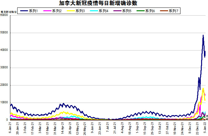 随着Omicron在加拿大在社区内传播,“第五波”疫情在加拿大彻底大爆发。加国生活网小编专门统计了从2021年1月6日至2022年1月5日的五个省份的新增确诊数,并制作了如下曲线图,让大家能一目了然地了解加拿大新冠疫情的发展趋势。按新增确诊数由多至少的排列分别是:魁省新增14486、安省新增11582、艾省新增4752、BC省新增3798、曼省新增1787、新斯科舍省新增842(未在下图显示)、新不伦瑞克省新增779(未在下图显示)、纽芬兰与拉布拉多省新增479(未在下图显示)、萨省新增541。