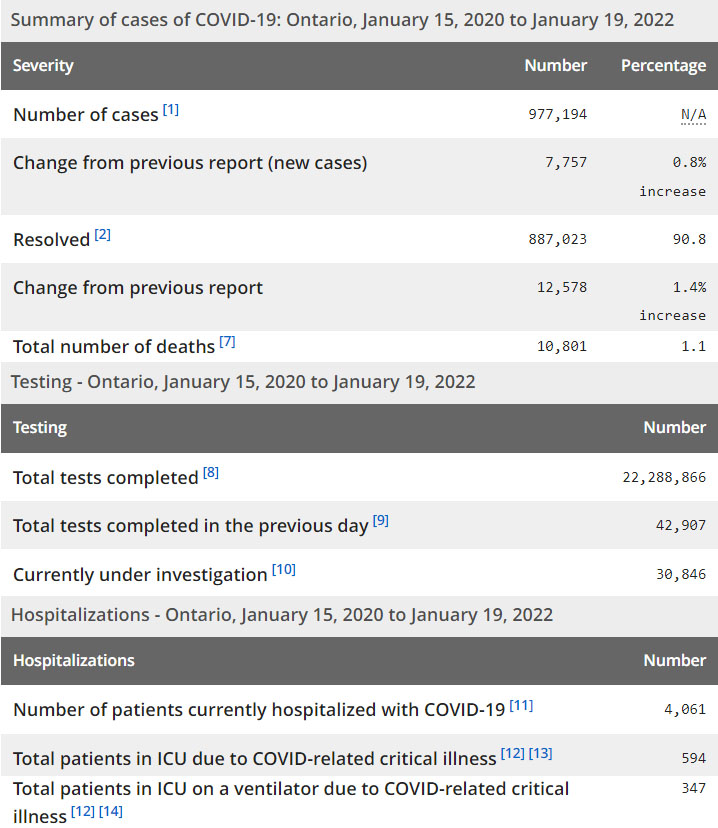 再看看安省方面的详细数据,截止2022年1月19日,安省已对22,288,866例进行了新冠病毒检测(检测数较昨天新增42,907),还有30,846处于被调查阶段。确诊总数977,194(当天新增7,757;阳性率上升至18.1%),包括887,023例康复(康复率上升为90.8%)、10,801例死亡(增加75例,死亡率仍为1.1%)。住院患者4,061例(减少71);进入ICU患者594例(增加5);IU插呼吸机患者347(增加6)。另:多伦多各个社区的疫情地图请点击这里。