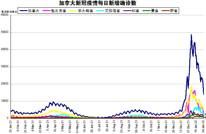 周末终于结束了,停止更新的所有省份也都终于更新数据了,加国生活网小编将3天新增的25855(上周末三天新增41460)进行了分解。随着Omicron在加拿大在社区内传播,“第五波”疫情在加拿大彻底大爆发。加国生活网小编专门统计了从2021年1月25日至2022年1月24日的五个省份的新增确诊数,并制作了如下曲线图,让大家能一目了然地了解加拿大新冠疫情的发展趋势。加拿大当日新增13925例,按新增确诊数由多至少的排列分别是:安省新增4790、魁省新增2807、艾省新增1801、BC省新增1345、萨省新增915、曼省新增536。