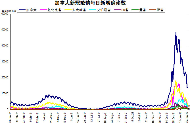 随着Omicron在加拿大在社区内传播,“第五波”疫情在加拿大彻底大爆发。加国生活网小编专门统计了从2021年1月26日至2022年1月25日的五个省份的新增确诊数,并制作了如下曲线图,让大家能一目了然地了解加拿大新冠疫情的发展趋势。加拿大当日新增14164例,按新增确诊数由多至少的排列分别是:安省新增3424、魁省新增2977、艾省新增2722、BC省新增1711、萨省新增1048、曼省新增637。