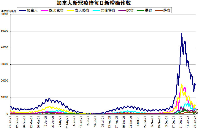 随着Omicron在加拿大在社区内传播,“第五波”疫情在加拿大彻底大爆发。加国生活网小编专门统计了从2021年1月29日至2022年1月28日的五个省份的新增确诊数,并制作了如下曲线图,让大家能一目了然地了解加拿大新冠疫情的发展趋势。加拿大当日新增17695例,按新增确诊数由多至少的排列分别是:安省新增5337、魁省新增3600、艾省新增3036、BC省新增1634、萨省新增1412、曼省新增891。