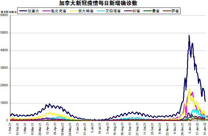 周末终于结束了,停止更新的所有省份也都终于更新数据了,加国生活网小编将3天新增的19898(上周末三天新增25855)进行了分解。随着Omicron在加拿大在社区内传播,“第五波”疫情在加拿大彻底大爆发。加国生活网小编专门统计了从2021年2月1日至2022年1月31日的五个省份的新增确诊数,并制作了如下曲线图,让大家能一目了然地了解加拿大新冠疫情的发展趋势。加拿大当日新增10843例,按新增确诊数由多至少的排列分别是:安省新增3043、魁省新增2423、艾省新增1777、BC省新增1057、萨省新增748、曼省新增505。