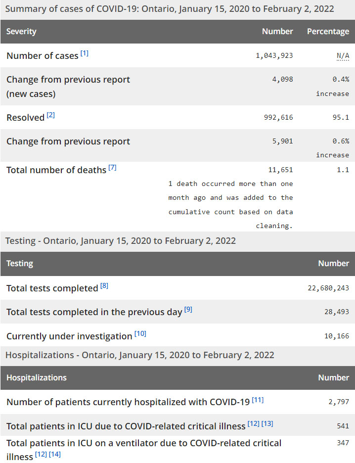 再看看安省方面的详细数据,截止2022年2月2日,安省已对22,680,243例进行了新冠病毒检测(检测数较昨天新增28,493),还有10,166处于被调查阶段。确诊总数1,043,923(当天新增4,098;阳性率上升至14.4%),包括992,616例康复(康复率上升为95.1%)、11,651例死亡(增加75例,死亡率仍为1.1%)。住院患者2,797例(减少142);进入ICU患者541例(减少14);IU插呼吸机患者347(增加10)。另:多伦多各个社区的疫情地图请点击这里。