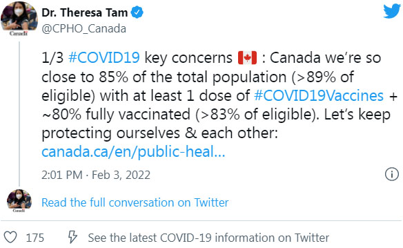 —— 加拿大首席公共卫生官Theresa Tam博士在社交媒体Twitter发贴子表示,加拿大疫苗接种运动已经接近一个“里程碑”,近85%的总人口(超过89%符合条件的人群)至少接种了一剂疫苗,约80%的总人口(超过83%符合条件的人群)已完全接种了疫苗(二剂疫苗)。