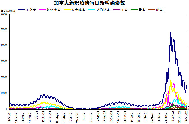 随着Omicron在加拿大在社区内传播,“第五波”疫情在加拿大彻底大爆发。加国生活网小编专门统计了从2021年2月4日至2022年2月3日的五个省份的新增确诊数,并制作了如下曲线图,让大家能一目了然地了解加拿大新冠疫情的发展趋势。加拿大当日新增14217例,按新增确诊数由多至少的排列分别是:安省新增4098、魁省新增3592、艾省新增2370、BC省新增1518、萨省新增851、曼省新增357。