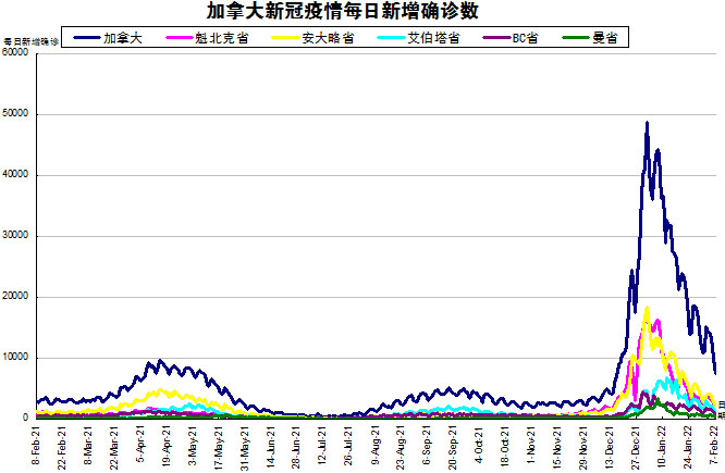 周末终于结束了,停止更新的所有省份也都终于更新数据了,加国生活网小编将3天新增的14611(上周末三天新增19898)进行了分解。随着Omicron在加拿大在社区内传播,“第五波”疫情在加拿大彻底大爆发。加国生活网小编专门统计了从2021年2月8日至2022年2月7日的五个省份的新增确诊数,并制作了如下曲线图,让大家能一目了然地了解加拿大新冠疫情的发展趋势。加拿大当日新增7527例,按新增确诊数由多至少的排列分别是:魁省新增2240、安省新增2088、艾省新增1123、BC省新增843、曼省新增258。由于萨省从2月7日起,将停止发布每日疫情报告,改为每周四报告疫情信息,因此以下曲线图将不再统计萨省的数据。