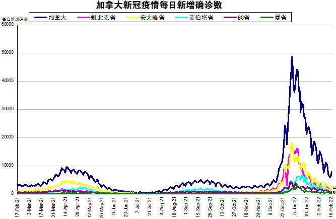 随着Omicron在加拿大在社区内传播,“第五波”疫情在加拿大彻底大爆发。加国生活网小编专门统计了从2021年2月17日至2022年2月16日的五个省份的新增确诊数,并制作了如下曲线图,让大家能一目了然地了解加拿大新冠疫情的发展趋势。加拿大当日新增8016例,按新增确诊数由多至少的排列分别是:安省新增2532、魁省新增2328、艾省新增888、BC省新增750、曼省新增338。