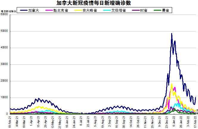 随着Omicron在加拿大在社区内传播,“第五波”疫情在加拿大彻底大爆发。加国生活网小编专门统计了从2021年2月18日至2022年2月17日的五个省份的新增确诊数,并制作了如下曲线图,让大家能一目了然地了解加拿大新冠疫情的发展趋势。加拿大当日新增10230例,按新增确诊数由多至少的排列分别是:安省新增2327、魁省新增2055、艾省新增813、BC省新增782、曼省新增415。由于萨省的数据现在改为每周四更新一次,而上次是更新到2月6日,因此2月17日更新的数据是从2月7日至2月17日的总数,即萨省10天共新增2522例,平均每天252例。