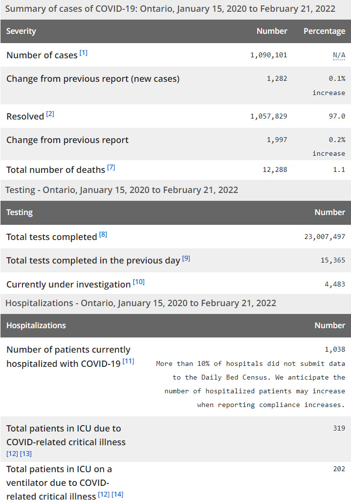 再看看安省方面的详细数据,截止2022年2月21日,安省已对23,007,497例进行了新冠病毒检测(检测数较昨天新增15,365),还有4,483处于被调查阶段。确诊总数1,090,101(当天新增1,282;阳性率下降至8.34%),包括1,057,829例康复(康复率上升为97.0%)、12,288例死亡(增加41例,死亡率仍为1.1%)。住院患者1,038例(减少18,有10%医院逢周末没有提交数据);进入ICU患者319例(减少5);IU插呼吸机患者202(减少6)。另:多伦多各个社区的疫情地图请点击这里。