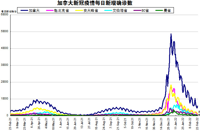 Family长周末终于结束了,停止更新的大部分省份也都终于更新数据了,加国生活网小编将4天新增的11123(上周末3天新增10618)进行了分解。随着Omicron在加拿大在社区内传播,“第五波”疫情在加拿大彻底大爆发。加国生活网小编专门统计了从2021年2月23日至2022年2月22日的五个省份的新增确诊数,并制作了如下曲线图,让大家能一目了然地了解加拿大新冠疫情的发展趋势。加拿大当日新增5841例,按新增确诊数由多至少的排列分别是:魁省新增1438、安省新增1282、BC省新增477、艾省新增400、曼省新增199。