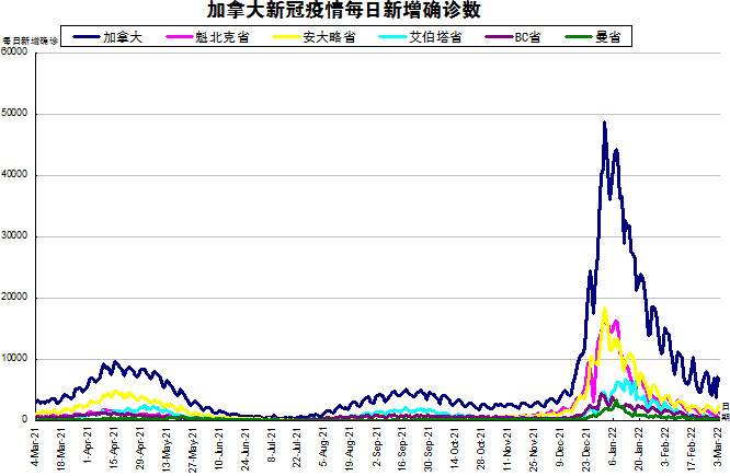 随着Omicron在加拿大在社区内传播,“第五波”疫情在加拿大彻底大爆发。加国生活网小编专门统计了从2021年3月4日至2022年3月3日的五个省份的新增确诊数,并制作了如下曲线图,让大家能一目了然地了解加拿大新冠疫情的发展趋势。加拿大当日新增6600例,按新增确诊数由多至少的排列分别是:安省新增2262、魁省新增1257、BC省新增539、艾省新增391、曼省新增162。