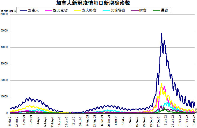 周末终于结束了,停止更新的大部分省份也都终于更新数据了,加国生活网小编将3天新增的8332(上周末3天新增9166)进行了分解。随着Omicron在加拿大在社区内传播,“第五波”疫情在加拿大彻底大爆发。加国生活网小编专门统计了从2021年3月8日至2022年3月7日的五个省份的新增确诊数,并制作了如下曲线图,让大家能一目了然地了解加拿大新冠疫情的发展趋势。加拿大当日新增6789例,按新增确诊数由多至少的排列分别是:安省新增1074、魁省新增775、BC省新增285、艾省新增282、曼省新增88。