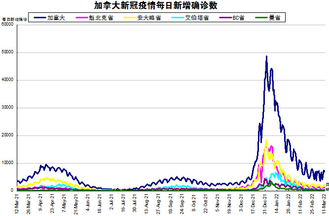 随着Omicron在加拿大在社区内传播,“第五波”疫情在加拿大彻底大爆发。加国生活网小编专门统计了从2021年3月12日至2022年3月11日的五个省份的新增确诊数,并制作了如下曲线图,让大家能一目了然地了解加拿大新冠疫情的发展趋势。加拿大当日新增6849例,按新增确诊数由多至少的排列分别是:安省新增2130、魁省新增1179、艾省新增473、BC省新增288、曼省新增194。