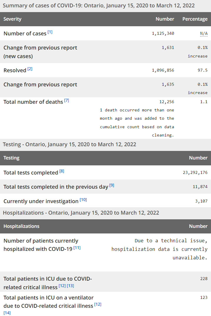 再看看安省方面的详细数据,截止2022年3月12日,安省已对23,292,176例进行了新冠病毒检测(检测数较昨天新增11,874),还有3,107处于被调查阶段。确诊总数1,125,340(当天新增1,631;阳性率下降至13.74%),包括1,096,856例康复(康复率仍为97.5%)、12,256例死亡(增加9例,死亡率仍为1.1%)。住院患者722例(由于技术问题,目前无法获得当天住院数据);进入ICU患者228(减少4);IU插呼吸机患者123(减少6)。另:多伦多各个社区的疫情地图请点击这里。