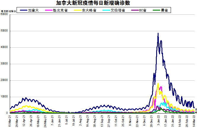 周末终于结束了,停止更新的一些省份也都终于更新数据了,加国生活网小编将3天新增的7150(上周末3天新增8332)进行了分解。随着Omicron在加拿大在社区内传播,“第五波”疫情在加拿大彻底大爆发。加国生活网小编专门统计了从2021年3月15日至2022年3月14日的五个省份的新增确诊数,并制作了如下曲线图,让大家能一目了然地了解加拿大新冠疫情的发展趋势。加拿大当日新增3496例,按新增确诊数由多至少的排列分别是:安省新增1116、魁省新增670、艾省新增447、BC省新增198、曼省新增111。