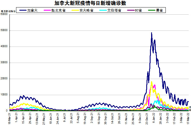 随着Omicron在加拿大在社区内传播,“第五波”疫情在加拿大彻底大爆发。加国生活网小编专门统计了从2021年3月18日至2022年3月17日的五个省份的新增确诊数,并制作了如下曲线图,让大家能一目了然地了解加拿大新冠疫情的发展趋势。加拿大当日新增5856例,按新增确诊数由多至少的排列分别是:安省新增2398、魁省新增1462、艾省新增619、BC省新增240、曼省新增234。