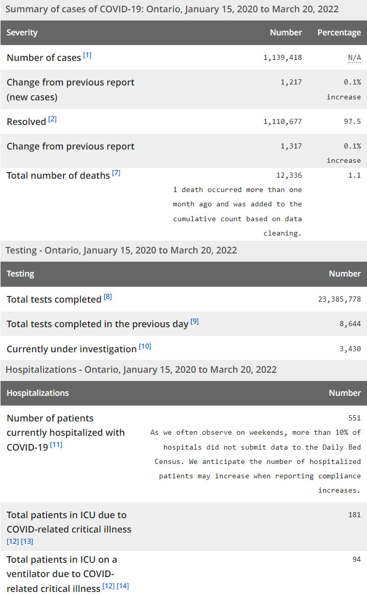再看看安省方面的详细数据,截止2022年3月20日,安省已对23,385,778例进行了新冠病毒检测(检测数较昨天新增8,644),还有3,430处于被调查阶段。确诊总数1,139,418(当天新增1,217;阳性率下降至14.08%),包括1,110,677例康复(康复率仍为97.5%)、12,336例死亡(增加4例,死亡率仍为1.1%)。住院患者551例(未变,周末有10%医院没有更新数据);进入ICU患者181(减少1);IU插呼吸机患者94(减少3)。另:多伦多各个社区的疫情地图请点击这里。