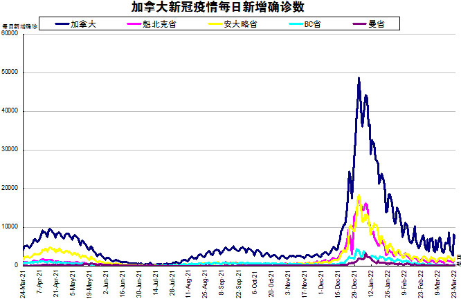 随着Omicron在加拿大在社区内传播,“第五波”疫情在加拿大彻底大爆发。加国生活网小编专门统计了从2021年3月24日至2022年3月23日的五个省份的新增确诊数,并制作了如下曲线图,让大家能一目了然地了解加拿大新冠疫情的发展趋势。加拿大当日新增7355例,按新增确诊数由多至少的排列分别是:安省新增2149、魁省新增2111、BC省新增269、曼省新增137。