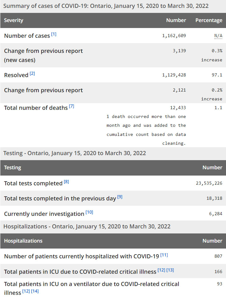 再看看安省方面的详细数据,截止2022年3月30日,安省已对23,535,226例进行了新冠病毒检测(检测数较昨天新增18,318),还有6,284处于被调查阶段。确诊总数1,162,609(当天新增3,139;阳性率上升至17.14%),包括1,129,428例康复(康复率下降为97.1%)、12,433例死亡(增加6例,死亡率仍为1.1%)。住院患者807例(增加29例);进入ICU患者166(增加1);IU插呼吸机患者93(减少1)。另:多伦多各个社区的疫情地图请点击这里。