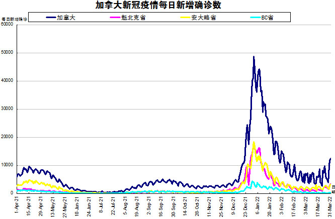 随着Omicron亚变体BA.2在加拿大在社区内传播,“第六波”疫情已经开始了。加国生活网小编专门统计了从2021年4月1日至2022年3月31日的三个省份的新增确诊数,并制作了如下曲线图,让大家能一目了然地了解加拿大新冠疫情的发展趋势。加拿大当日新增12519例,按新增确诊数由多至少的排列分别是:魁省新增3319、安省新增3139、BC省新增249。当天新增的病例中,还包括曼省一周新增307、萨省一周新增1196、新斯科舍省一周新增4188。