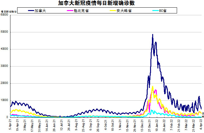 周末终于结束了,停止更新的一些省份也都终于更新数据了,加国生活网小编将3天新增的11708(上周末3天新增9431)进行了分解。随着Omicron亚变体BA.2在加拿大在社区内传播,“第六波”疫情又要开始了。加国生活网小编专门统计了从2021年4月5日至2022年4月4日的三个省份的新增确诊数,并制作了如下曲线图,让大家能一目了然地了解加拿大新冠疫情的发展趋势。加拿大当日新增5019例,按新增确诊数由多至少的排列分别是:魁省新增2331、安省新增2248、BC省新增255、纽省新增154。