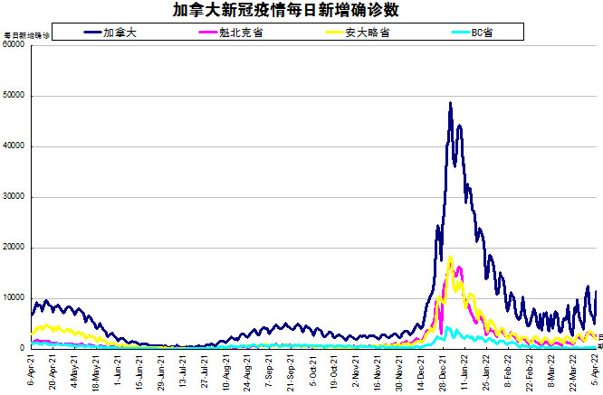 随着Omicron亚变体BA.2在加拿大在社区内传播,“第六波”疫情又要开始了。加国生活网小编专门统计了从2021年4月6日至2022年4月5日的三个省份的新增确诊数,并制作了如下曲线图,让大家能一目了然地了解加拿大新冠疫情的发展趋势。加拿大当日新增11308例,按新增确诊数由多至少的排列分别是:魁省新增2615、安省新增1991、BC省新增172(BC省表示由于PCR检测受限制,现在报告的数字已经不能反应真实情况,所以BC省从周四起改成每周四更新)。