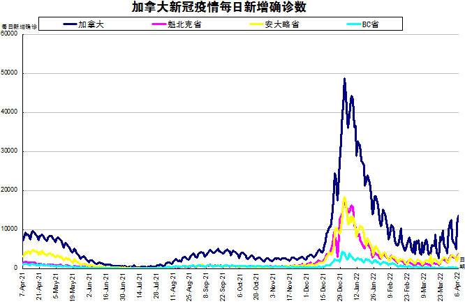 随着Omicron亚变体BA.2在加拿大在社区内传播,“第六波”疫情又要开始了。加国生活网小编专门统计了从2021年4月7日至2022年4月6日的三个省份的新增确诊数,并制作了如下曲线图,让大家能一目了然地了解加拿大新冠疫情的发展趋势。加拿大当日新增13597例,按新增确诊数由多至少的排列分别是:魁省新增3761、安省新增3444、BC省新增216(BC省表示由于PCR检测受限制,现在报告的数字已经不能反应真实情况,所以BC省从周四起改成每周四更新,今天是最后一次每日更新);艾省一周新增5514例。