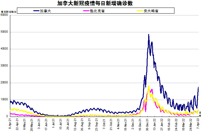 随着Omicron亚变体BA.2在加拿大在社区内传播,“第六波”疫情又要开始了。加国生活网小编专门统计了从2021年4月8日至2022年4月7日的三个省份的新增确诊数,并制作了如下曲线图,让大家能一目了然地了解加拿大新冠疫情的发展趋势。加拿大当日新增17407例,按新增确诊数由多至少的排列分别是:安省新增4224、魁省新增3777、曼省确诊一周新增1359、萨省一周新增1032、新斯科舍省一周新增6991。由于BC省变成每周四更新,今天更新的是3月27日至4月2日的一周数据,因此从今天起下图表的数据将不包括BC省。