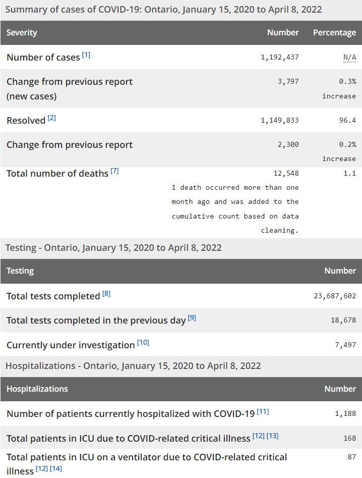 再看看安省方面的详细数据,截止2022年4月8日,安省已对23,687,602例进行了新冠病毒检测(检测数较昨天新增18,678),还有7,497处于被调查阶段。确诊总数1,192,437(当天新增3,797;阳性率下降至20.33%),包括1,149,833例康复(康复率下降为96.4%)、12,548例死亡(增加11例,死亡率仍为1.1%)。住院患者1188例(增加53例);进入ICU患者168(增加2);IU插呼吸机患者87(增加1)。另:多伦多各个社区的疫情地图请点击这里。