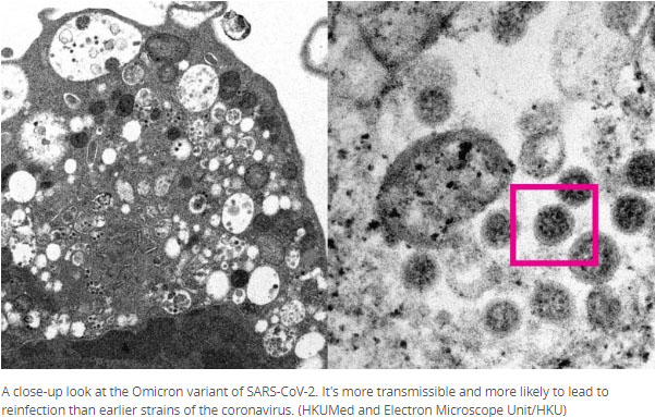 近距离观察 SARS-CoV-2 的 Omicron 变体。与早期的冠状病毒株相比,它更容易传播,也更有可能导致再感染。(港大医学及电子显微镜组/港大)