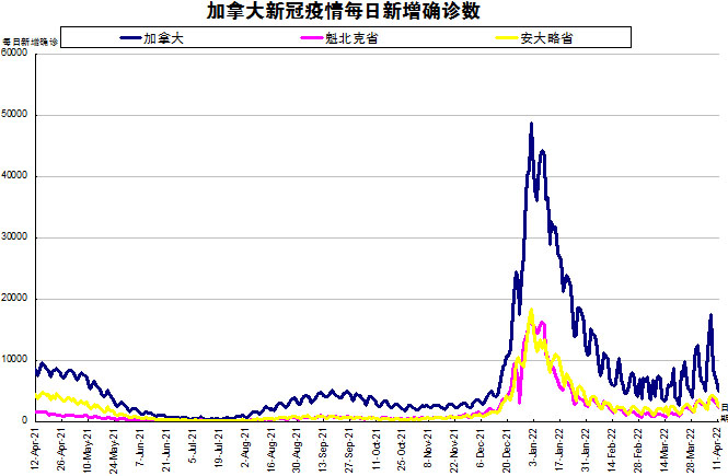 周末终于结束了,停止更新的一些省份也都终于更新数据了,加国生活网小编将3天新增的11393(上周末3天新增11708)进行了分解。随着Omicron亚变体BA.2在加拿大在社区内传播,“第六波”疫情正在加拿大爆发。加国生活网小编专门统计了从2021年4月12日至2022年4月11日的二个省份的新增确诊数,并制作了如下曲线图,让大家能一目了然地了解加拿大新冠疫情的发展趋势。加拿大当日新增4937例,按新增确诊数由多至少的排列分别是:安省新增2401、魁省新增2234、纽省新增157。