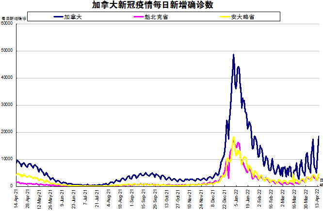随着Omicron亚变体BA.2在加拿大在社区内传播,“第六波”疫情正在加拿大爆发。加国生活网小编专门统计了从2021年4月15日至2022年4月14日的二个省份的新增确诊数,并制作了如下曲线图,让大家能一目了然地了解加拿大新冠疫情的发展趋势。加拿大当日新增18483例,按新增确诊数由多至少的排列分别是:安省新增4589、魁省新增3190。