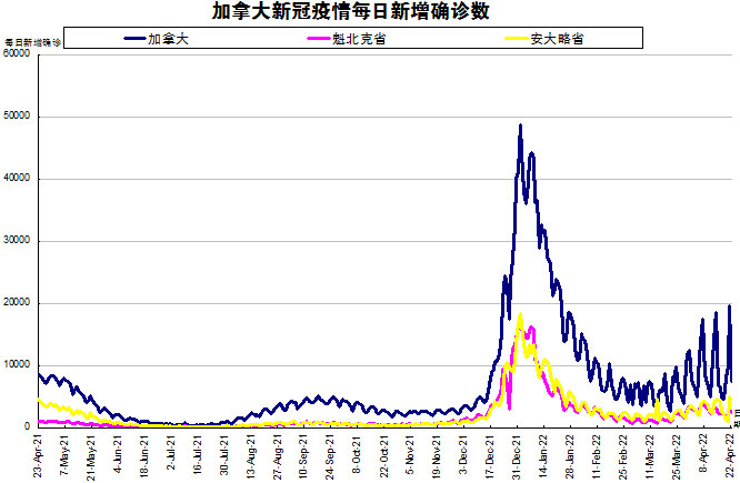 随着Omicron亚变体BA.2在加拿大在社区内传播,“第六波”疫情正在加拿大爆发。加国生活网小编专门统计了从2021年4月23日至2022年4月22日的二个省份的新增确诊数,并制作了如下曲线图,让大家能一目了然地了解加拿大新冠疫情的发展趋势。加拿大当日新增7464例,按新增确诊数由多至少的排列分别是:安省新增4668、魁省新增2499。