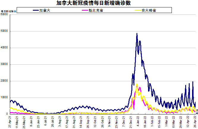 随着Omicron亚变体BA.2在加拿大在社区内传播,“第六波”疫情正在加拿大爆发。加国生活网小编专门统计了从2021年4月27日至2022年4月26日的二个省份的新增确诊数,并制作了如下曲线图,让大家能一目了然地了解加拿大新冠疫情的发展趋势。加拿大当日新增7240例,按新增确诊数由多至少的排列分别是:安省新增1827、魁省新增1670。
