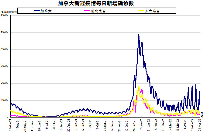 随着Omicron亚变体BA.2在加拿大在社区内传播,“第六波”疫情正在加拿大爆发。加国生活网小编专门统计了从2021年4月30日至2022年4月29日的二个省份的新增确诊数,并制作了如下曲线图,让大家能一目了然地了解加拿大新冠疫情的发展趋势。加拿大当日新增4646例,按新增确诊数由多至少的排列分别是:安省新增2760、魁省新增1649。