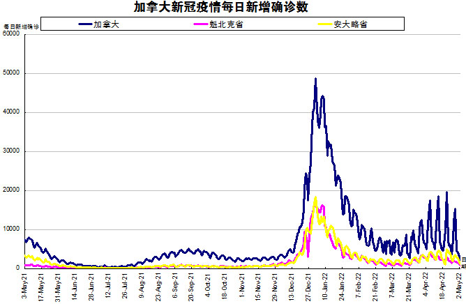 周末终于结束了,停止更新的一些省份也都终于更新数据了,加国生活网小编将3天新增的5143(上周末3天新增7516)进行了分解。随着Omicron亚变体BA.2在加拿大在社区内传播,“第六波”疫情正在加拿大爆发。加国生活网小编专门统计了从2021年5月3日至2022年5月2日的二个省份的新增确诊数,并制作了如下曲线图,让大家能一目了然地了解加拿大新冠疫情的发展趋势。加拿大当日新增2284例,按新增确诊数由多至少的排列分别是:安省新增1275、魁省新增906。