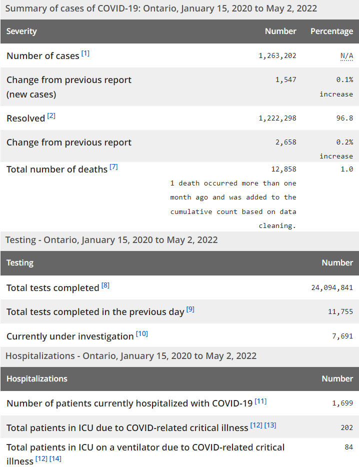 再看看安省方面的详细数据,截止2022年5月2日,安省已对24,094,841例进行了新冠病毒检测(检测数较昨天新增11,755),还有