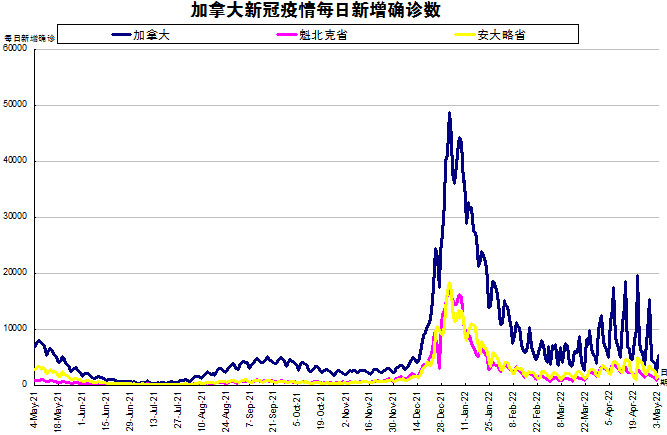 随着Omicron亚变体BA.2在加拿大在社区内传播,“第六波”疫情正在加拿大爆发。加国生活网小编专门统计了从2021年5月4日至2022年5月3日的二个省份的新增确诊数,并制作了如下曲线图,让大家能一目了然地了解加拿大新冠疫情的发展趋势。加拿大当日新增5305例,按新增确诊数由多至少的排列分别是:安省新增1547、魁省新增1194。