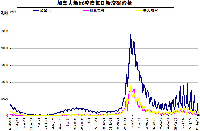 随着Omicron亚变体BA.2在加拿大在社区内传播,“第六波”疫情正在加拿大爆发。加国生活网小编专门统计了从2021年5月12日至2022年5月11日的二个省份的新增确诊数,并制作了如下曲线图,让大家能一目了然地了解加拿大新冠疫情的发展趋势。加拿大当日新增7627例,按新增确诊数由多至少的排列分别是:安省新增1995、魁省新增1101。另外,艾省一周新增4379。