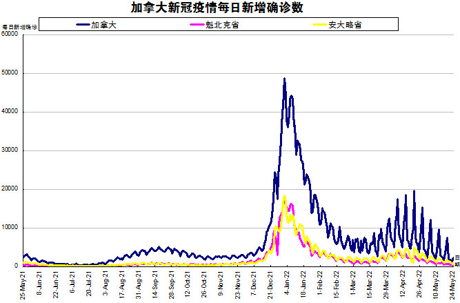 维多利亚日长周末终于结束了,停止更新的一些省份也都终于更新数据了,加国生活网小编将4天新增的4318(上周末3天新增2991)进行了分解。随着Omicron亚变体BA.2在加拿大在社区内传播,“第六波”疫情正在逐渐减弱。加国生活网小编专门统计了从2021年5月25日至2022年5月24日的二个省份的新增确诊数,并制作了如下曲线图,让大家能一目了然地了解加拿大新冠疫情的发展趋势。加拿大当日新增2272例,按新增确诊数由多至少的排列分别是:安省新增619、魁省新增417、新不伦瑞克省一周新增768、爱德华王子岛一周新增454。