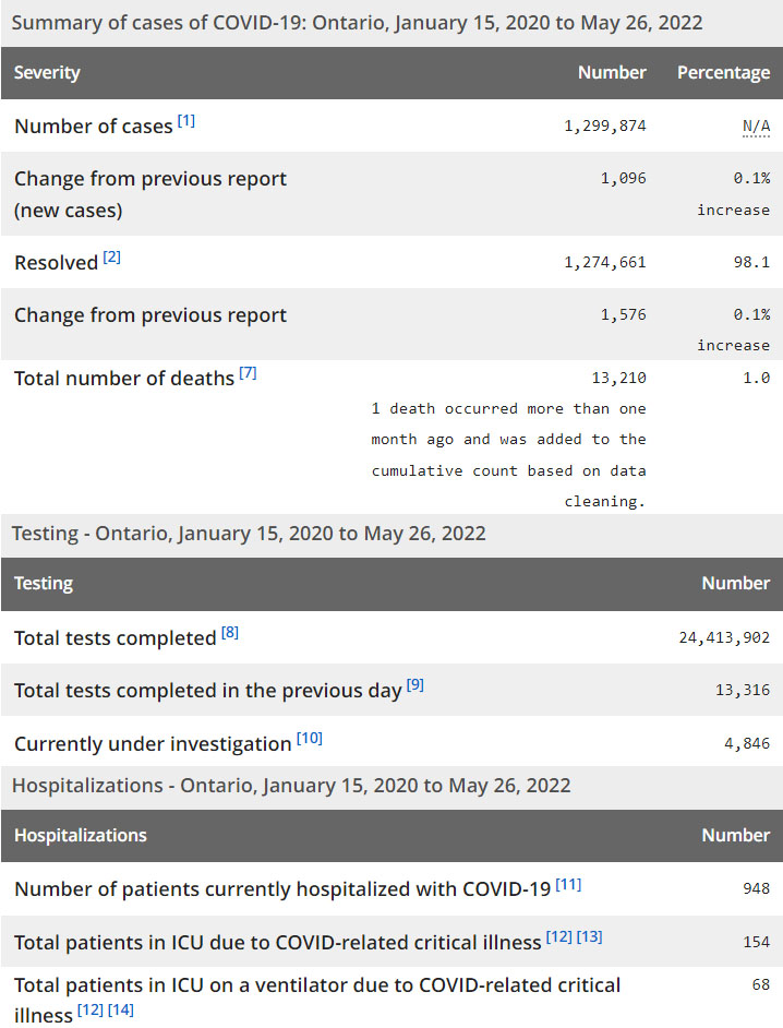 再看看安省方面的详细数据,截止2022年5月26日,安省已对24,413,902例进行了新冠病毒检测(检测数较昨天新增13,316),还有4,846 处于被调查阶段。确诊总数1,299,874(新增1,096;阳性率下降为8.23%),包括1,274,661例康复(康复率上升为98.1%)、13,210例死亡(增加15例,死亡率仍为1.0%)。住院患者948例(减少134例);进入ICU患者154(未变);ICU插呼吸机患者68(减少1例)。另:多伦多各个社区的疫情地图请点击这里。