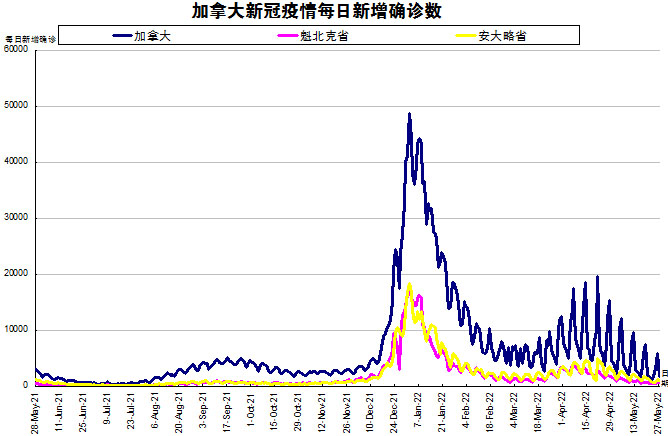 随着Omicron亚变体BA.2在加拿大在社区内传播,“第六波”疫情正在逐渐减弱。加国生活网小编专门统计了从2021年5月28日至2022年5月27日的二个省份的新增确诊数,并制作了如下曲线图,让大家能一目了然地了解加拿大新冠疫情的发展趋势。加拿大当日新增1694例,按新增确诊数由多至少的排列分别是:安省新增1096、魁省新增590。