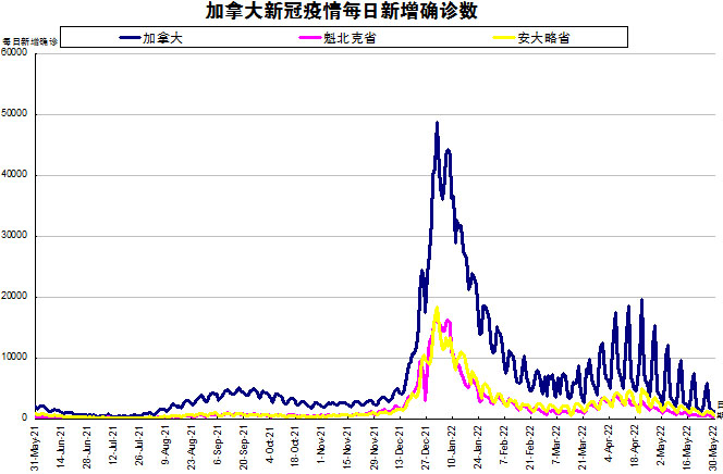 周末终于结束了,停止更新的一些省份也都终于更新数据了,加国生活网小编将3天新增的1948(上个长周末4天新增4318)进行了分解。随着Omicron亚变体BA.2在加拿大在社区内传播,“第六波”疫情正在逐渐减弱。加国生活网小编专门统计了从2021年5月31日至2022年5月30日的二个省份的新增确诊数,并制作了如下曲线图,让大家能一目了然地了解加拿大新冠疫情的发展趋势。加拿大当日新增1174例,按新增确诊数由多至少的排列分别是:魁省新增577、安省新增547。