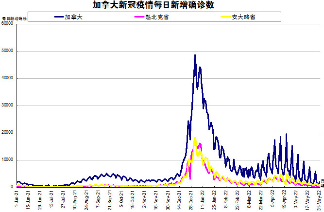 随着Omicron亚变体BA.2在加拿大在社区内传播,“第六波”疫情正在逐渐减弱。加国生活网小编专门统计了从2021年6月1日至2022年5月31日的二个省份的新增确诊数,并制作了如下曲线图,让大家能一目了然地了解加拿大新冠疫情的发展趋势。加拿大当日新增2134例,按新增确诊数由多至少的排列分别是:安省新增590、魁省新增513。另外,新不伦瑞克省一周新增554、爱德华王子岛一周新增476。
