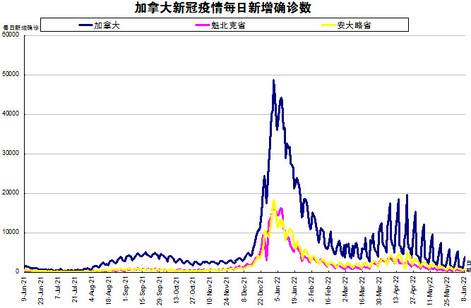 随着Omicron亚变体BA.2在加拿大在社区内传播,“第六波”疫情正在逐渐减弱。加国生活网小编专门统计了从2021年6月9日至2022年6月8日的二个省份的新增确诊数,并制作了如下曲线图,让大家能一目了然地了解加拿大新冠疫情的发展趋势。加拿大当日新增3867例,按新增确诊数由多至少的排列分别是:安省新增1013、魁省新增738。另外,艾省一周新增1651、纽芬兰与拉布拉多省一周新增464。