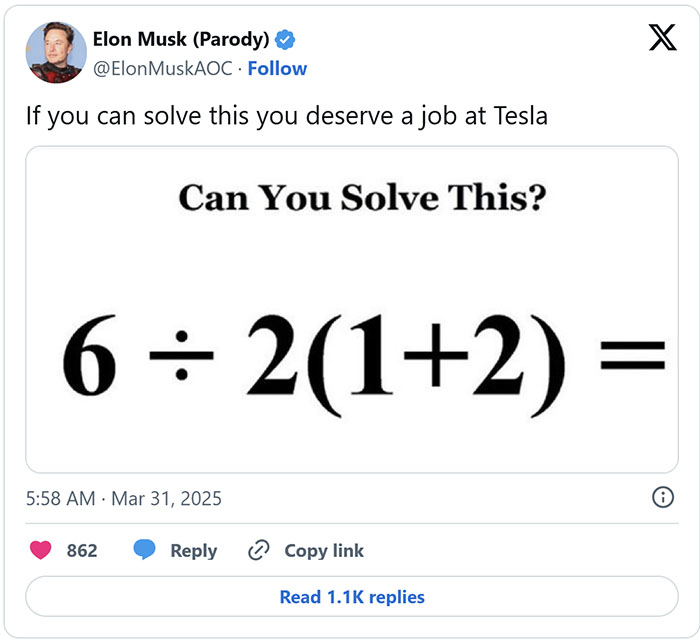 马斯克3月底在X贴出一张图片,内容是一道数学题目6÷2(1+2),他表示,如果有人可以解开这个问题,就有资格在特斯拉公司工作。