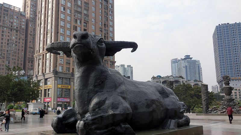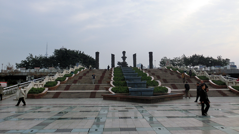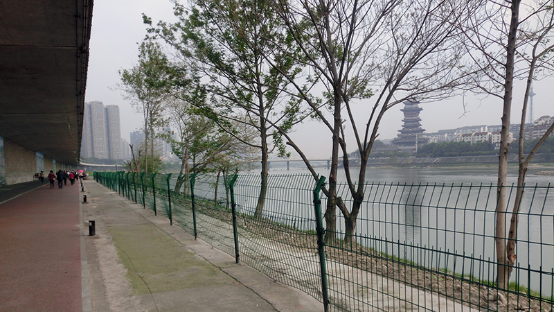 次日(4月15日),由于部分同学还在旅途上,圈主立坤安排大家自由活动。吃完早饭后,立坤喊道:“愿意去涪江边散步的跟我走”,有圈主带队,几乎全体人都跟他向宾馆后身的路上走去。穿过一个小广场,走了大约百米远,一条长龙般的水泥坝墙呈现在我们眼前,从小广场有花草间隔的双通道宽敞石梯通向坝墙的顶部,走上顶部发现原来是沿江延升的“二楼平台”,我用眼光大概测量一下,这个平台的一半落在坝体上,另一半是伸向涪江方向的一个大“屋檐”,估算有二三十米的宽度,靠涪江外侧建有水泥栏杆。平台下面也是一条水泥通道,一面紧靠坝体墙壁,另一面敞向江滩边,有铁丝网相隔,以阻拦行人靠近江沿浅滩。听万江介绍,涪江是长江支流嘉陵江的右岸最大支流,别看今天它安静流淌,等到雨季洪水来临之际,湍急江水会漫过老河堤,所以修建了这条带“二楼平台”的坝墙,以保护绵阳城区的安全。难怪在平台上建有一座高大的铁牛雕像,为当地人敬重的镇水之宝,而坝下的广场也起名为“铁牛广场”。