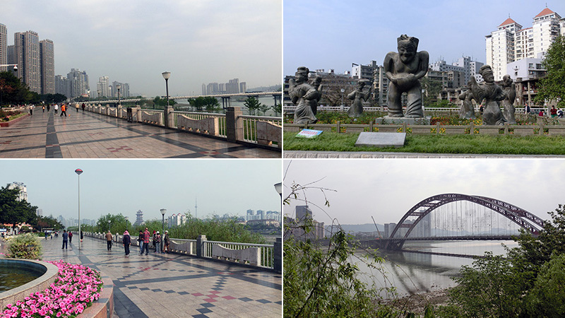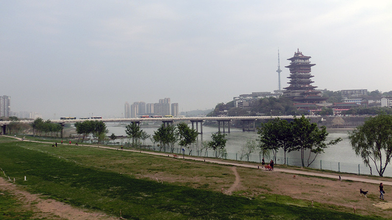 我们在平台上悠闲散步,并以涪江和越王楼为背景拍照留念,还从沿途楼梯下行到江边大道游览,看到这样一幅情景:几十名老大妈在“屋檐”下跳广场舞,她们携带的五颜六色衣物挂在铁丝护栏上,一个可爱的小女孩、一只白绒绒的宠物犬在涪江旁等候……在离渤海之滨千里远的四川盆地,同样也有许多同胞陶冶在健身的娱乐活动,享受着太平盛世的安宁,我为广袤祖国的繁荣昌盛、亿万百姓的安居乐业而深感幸福和自豪。