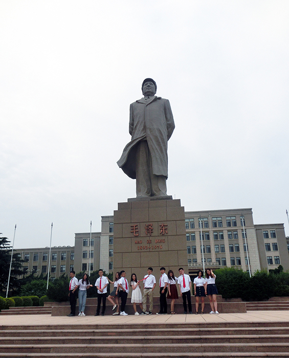 在毛主席塑像下,我遇到化工系2018届某班级毕业生正拍摄集体照,男生统一穿白衬衫系红领带,女生则穿着各异漂亮服装,正值青春年岁,风华亮丽,令爷爷辈的我无限羡慕,羡慕之余,自我宽慰当年我们也曾年轻过,又想起我辈在同一地点的那些黑白留影来,不觉哑然一笑。我看负责拍照的女生未将毛主席塑像整体拍摄进集体照里,就在后面随手抢拍了几个镜头,事后我把相机实拍的屏幕显影拿给她看,并答应回去发送,当场交流了各自QQ号码,果真,我一回家就把用PS软件处理好的七张照片发送了过去,就算老学友赠送年轻学友的一份心意吧。