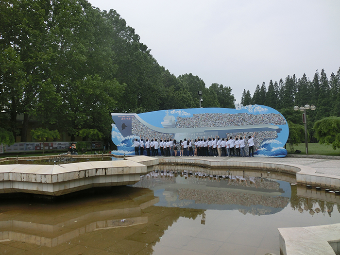 在主楼广场对面一处宽敞的绿草地上,竖立着一块硕大的照片像板,上面书写着“祝2018届毕业生前程似锦,母校永远是你后盾”的主标题,左上角则罗列着“传承红色基因,践行大工精神”和“薪火·担当”的副标题,板上以大海波浪为烘托,无规则地粘贴着成百上千张毕业生的照片,这种“集单为整”形成大规模人群集体照的形式倒挺新鲜,会让本届毕业生永生难忘,但今后想让自己或家人找到头像着实得花费功夫。正巧遇到一群毕业班同学以用手指寻找各自头像的方法合影,这样一个远视广角精彩瞬间也让我抢拍了下来,只可惜同学们走得快,我无法得知他们到底属于哪个系哪个班级,这张照片只能留给老学友自己欣赏、追忆了。